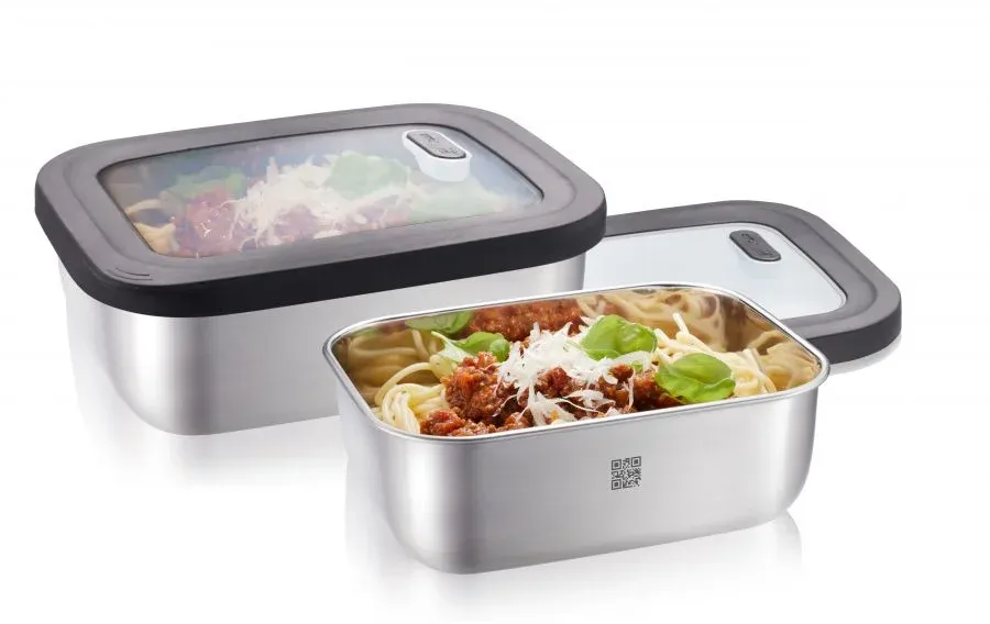 Pojemnik do przechowywania żywności w zestawie ze szczelną pokrywką. Został wykonany z wysokiej jakości stali nierdzewnej, a pokrywka z tworzywa sztucznego. Pudełko odporne jest na temperaturę do 300°C (bez pokrywki). Potrawy można przechowywać w zamrażarce do temperatury -2°C. Pojemniki z serii PROVIDO nadają się do kuchenki mikrofalowej oraz mycia w zmywarce.