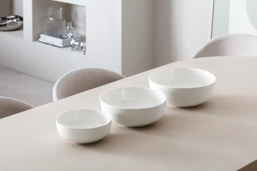 Kolekcję Afina wyróżnia wyjątkowy design, który łączy minimalistyczne formy ze starannie obmyślonymi detalami. Naczynia zdobi fascynujący relief w kształcie pierścienia, który dostarcza wyjątkowych wrażeń w dotyku, a starannie ukryta nóżka dodaje lekkości i stwarza niezwykły efekt unoszenia się w powietrzu. Niech elegancja i wyrafinowany styl zagości w Twoim domu!