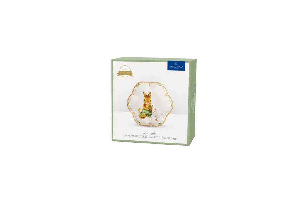 W skład wielkanocnej serii Annual Easter Edition wchodzą: kieliszek na jajko, talerz, miska, kubek oraz zawieszka jajko. Starannie zaprojektowany wzór roku 2026 przedstawia Annę, Maxa i Paula w szczegółowych, wiosennych sceneriach.