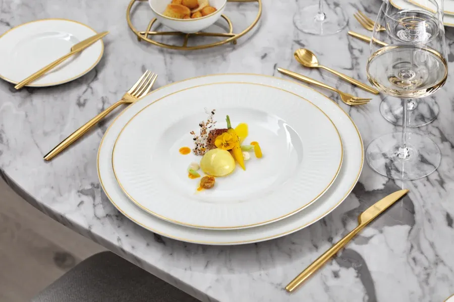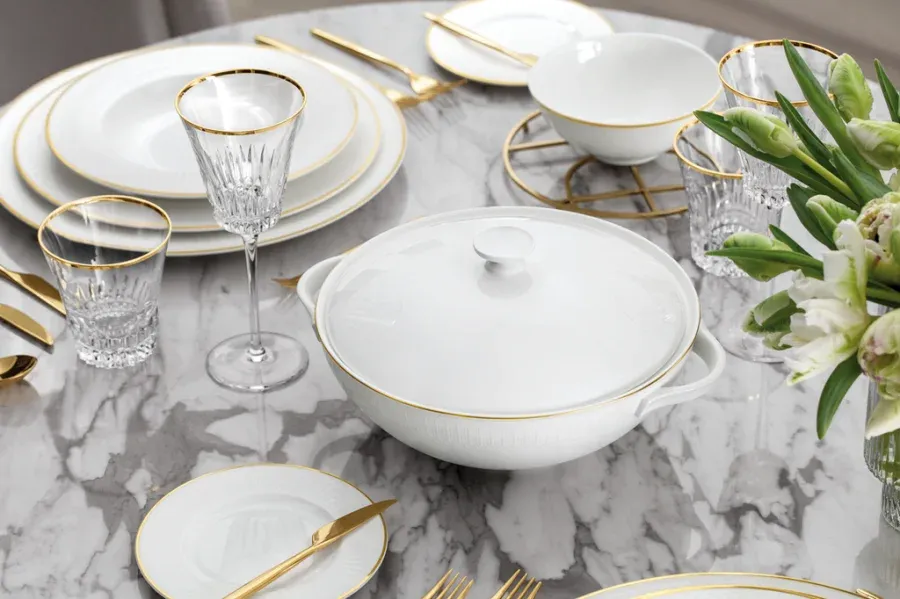 Kolekcja premium Château Septfontaines zachwyca niezwykłą elegancją, dopracowaniem każdego szczegółu, unikalnym wyglądem. Producent zastosował innowacyjną technikę zdobniczą: unikalny relief z błyszczącej porcelany i matowej dekoracji, z delikatnym wykończeniem 20-karatowym złotem. Szlachetna kolekcja łączy w sobie tradycję i nowoczesność. Kolekcja Château Septfontaines stworzy wyjątkową oprawę Twojego stołu, idealny pomysł na eksluzywny prezent.