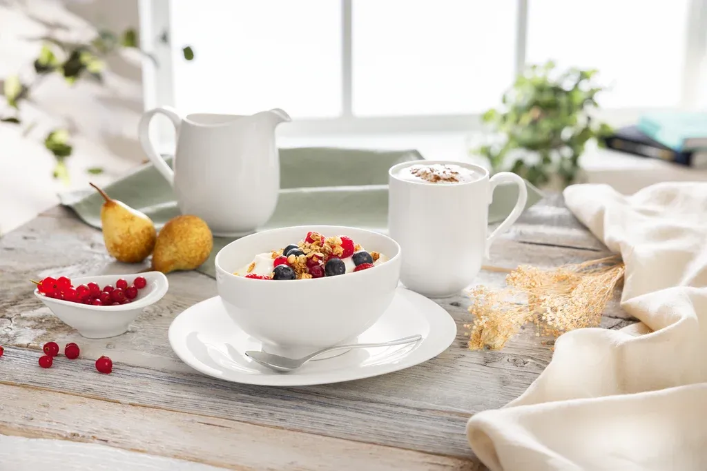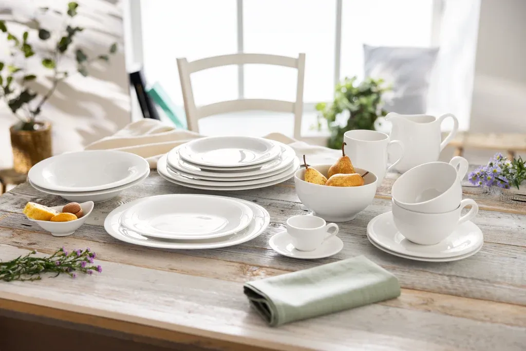 New Cottage Basic to biała zastawa, wykonana z porcelany Premium, wyróżniająca się subtelną elegancją. Kolekcja ta wykorzystuje harmonizujące ze sobą kształty inspirowane naturą. Sprawia wrażenie delikatnej, a przy tym doskonale odpowiada potrzebom nowoczesnego stylu życia. Osoby, które przywiązują wagę do tradycyjnych wartości, ale zarazem nie uciekają od nowoczesności, z pewnością zachwycą się kształtami New Cottage Basic. Produkty te pozwolą pięknie nakryć stół, a tym samym wykreować harmonijne otoczenie o indywidualnym charakterze. Wszystkie kształty naczyń doskonale ze sobą współgrają. Płynne przejście między dnem a brzegiem talerzy przywodzi na myśl formę filiżanki. Atrakcyjnym akcentem naczyń są uchwyty przypominające stylizowany liść.