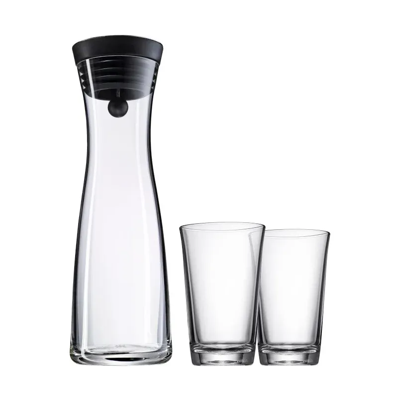 Karafka do wody firmy WMF w kształcie klasycznej butelki do mleka doskonale pasuje do wnętrza każdych drzwi lodówki. Szerokość szyjki i wylewki butelki umożliwia bezproblemowe wrzucenie kostek lodu jak również plasterków cytryny czy limonki. Opatentowany sposób zamknięcia i wylewki pozwala na nalewania bez efektu ściekających kropli wody po butelce. Stabilna, szeroka podstawa. W zestawie z karafką dwie szklanki o pojemności 250 ml.