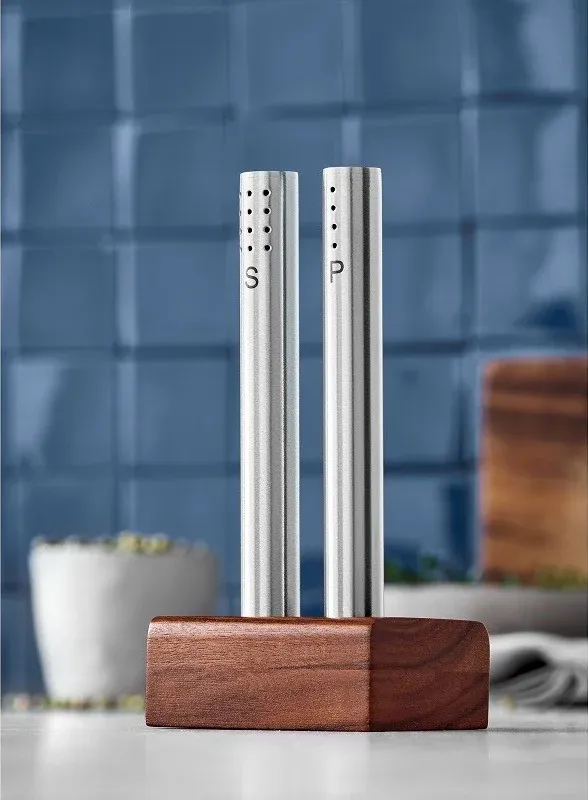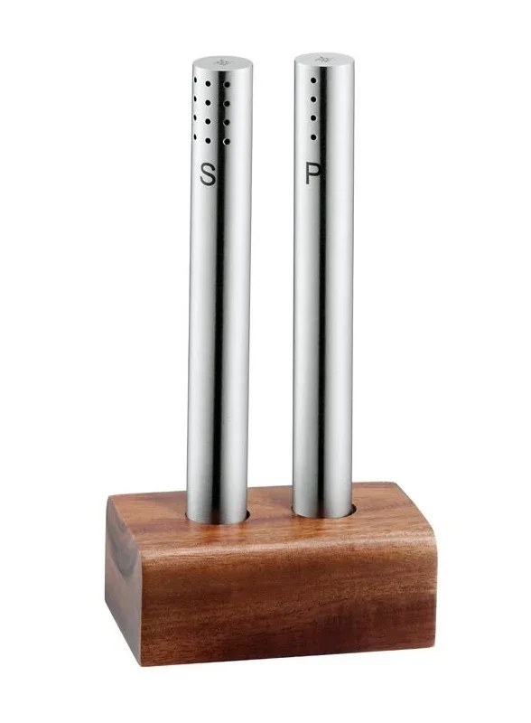 Minimalistyczny zestaw do przypraw na drewnianej podstawce. Napełniane od strony dna – lejek w zestawie.