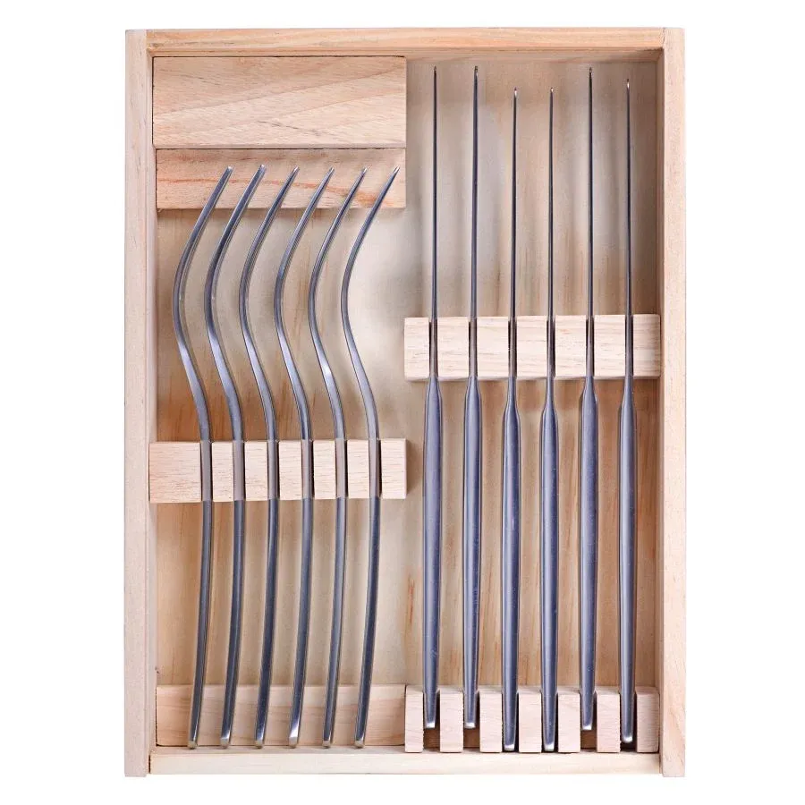 Sztućce są wykonane z wysokiej jakości stali nierdzewnej, połysk, spakowane w oryginalnym, drewnianym pudełku z przegródkami.